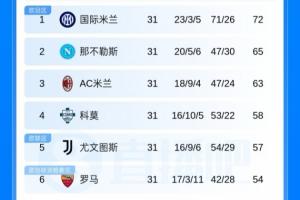体育资讯4月7日讯 意甲第31轮,米兰0-1客负那不勒斯遭排名反超、尤文2-0轻取热那亚距欧冠区仅1分。最新积分榜↓