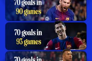 CBS体育晒图,统计球员打进欧冠70球时所用的场次。其中梅西90场70球历史最快,莱万93场70球第二,姆巴佩98场70球第三。