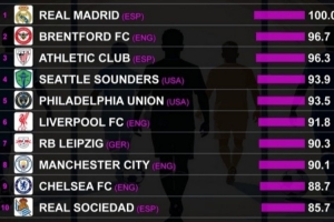 紧随皇马之后的是两种截然不同但同样高效的建队模式。布伦特福德已巩固为英超联赛中最稳健的项目之一,以优化资源利用和维持稳定性见长。毕尔巴鄂竞技则坚守其传统本色,持续打造具有延续性和集体感的球队。